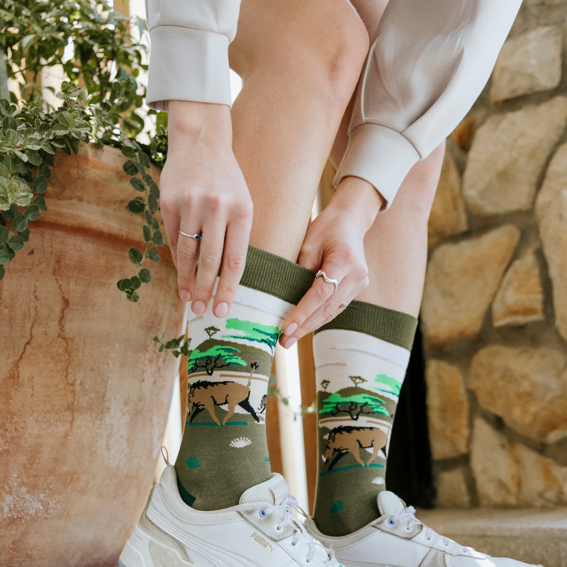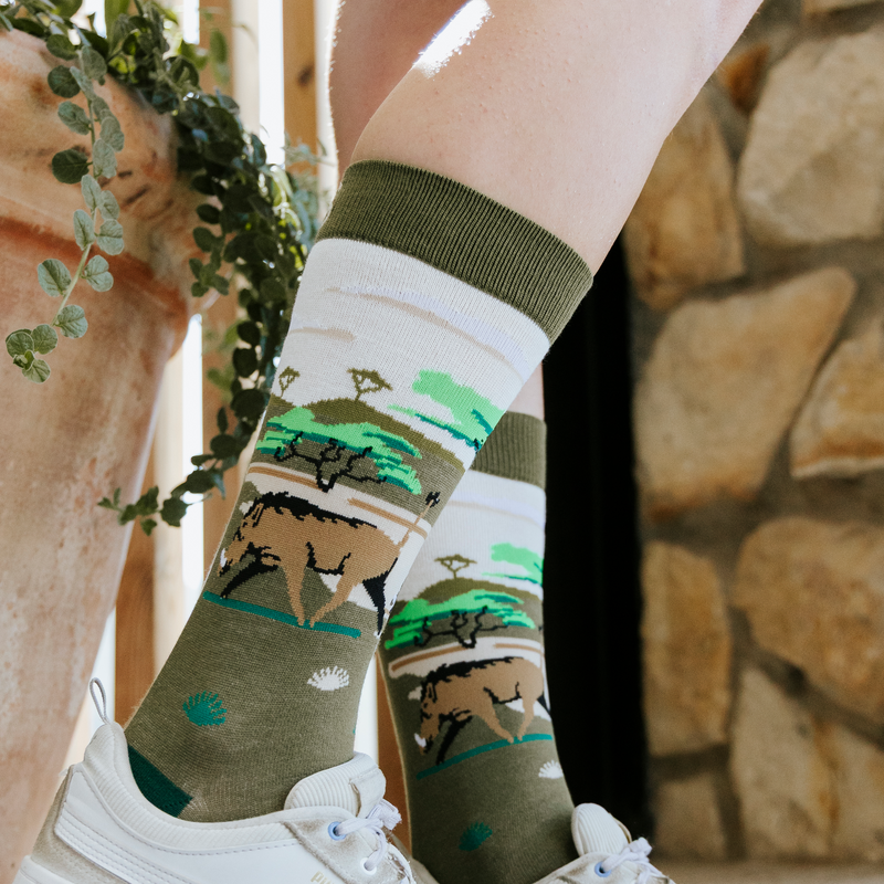 Pumba & Fam bamboo socks in natural grassland tones featuring warthogs in a safari landscape, comfortable novelty socks with a warm wildlife-inspired design.