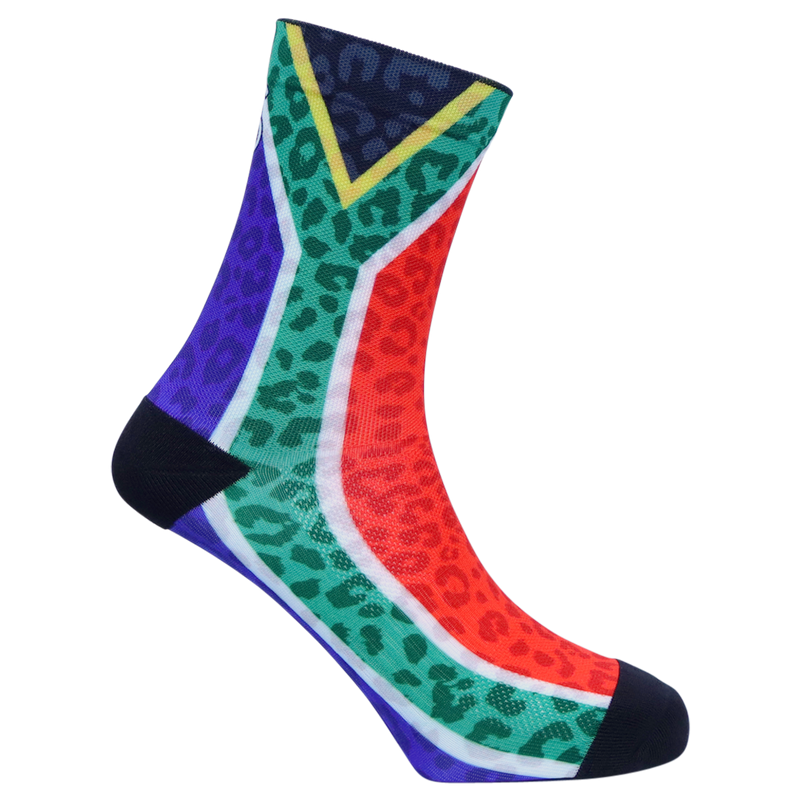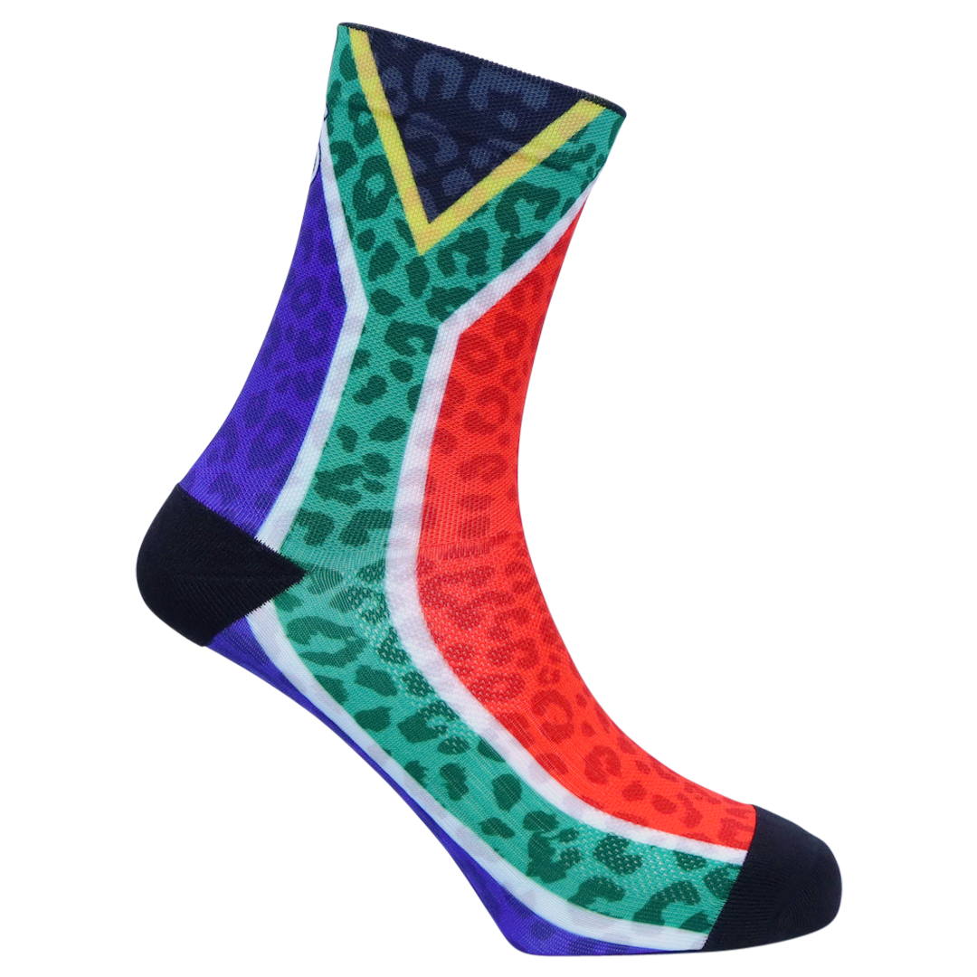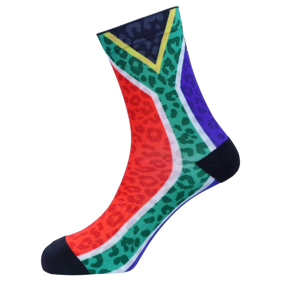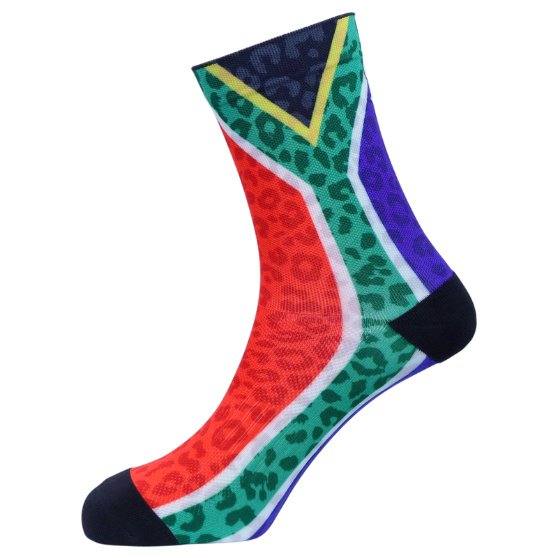 Made from Polyester, locally in Cape Town. For every pair you buy, we give school socks to a child in need.
