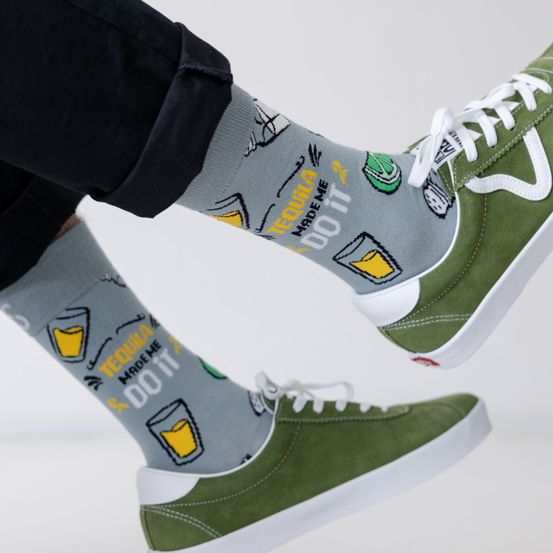 Salt, lime, and a shot of fun, our Tequila Did It socks are made for party starters and tequila lovers alike. With playful graphics of lime wedges, salt shakers, and shot glasses on a grey base, plus a cheeky “Tequila Made Me Do It” slogan.
